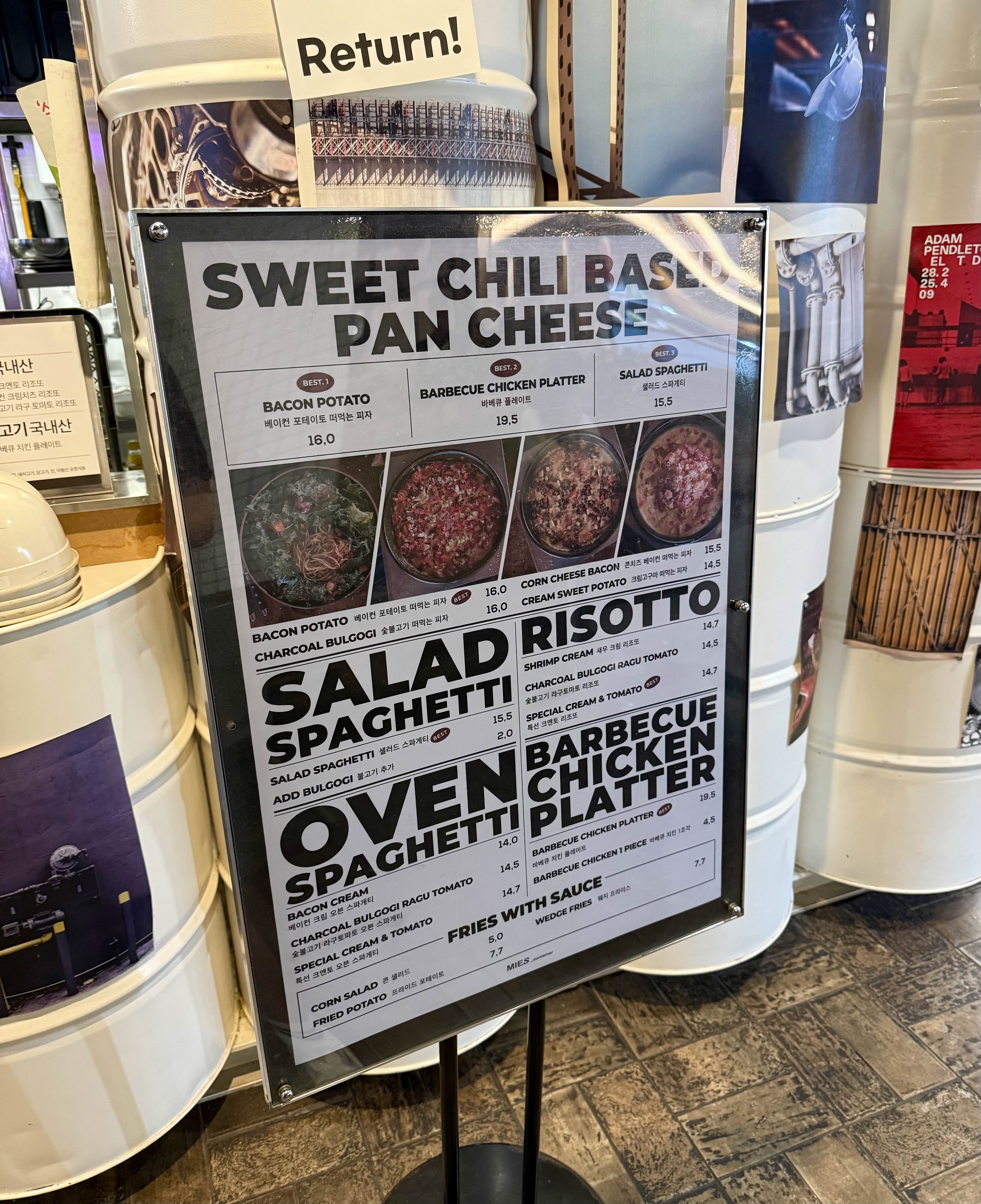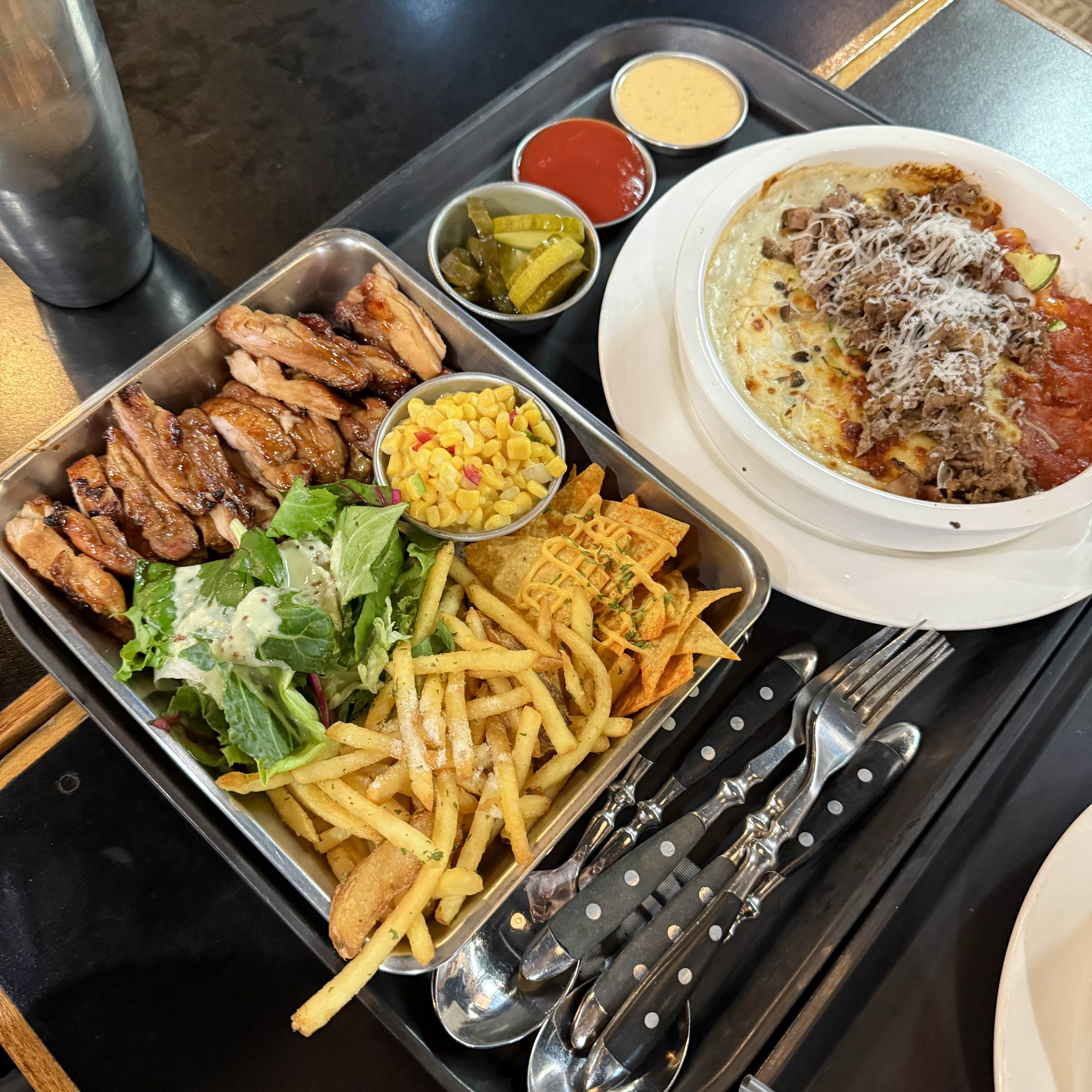 바베큐 치킨 플레터 , 숯불고기 토마토 리조또 그리고 베이컨 크림 오븐 스파게티 를 주문-