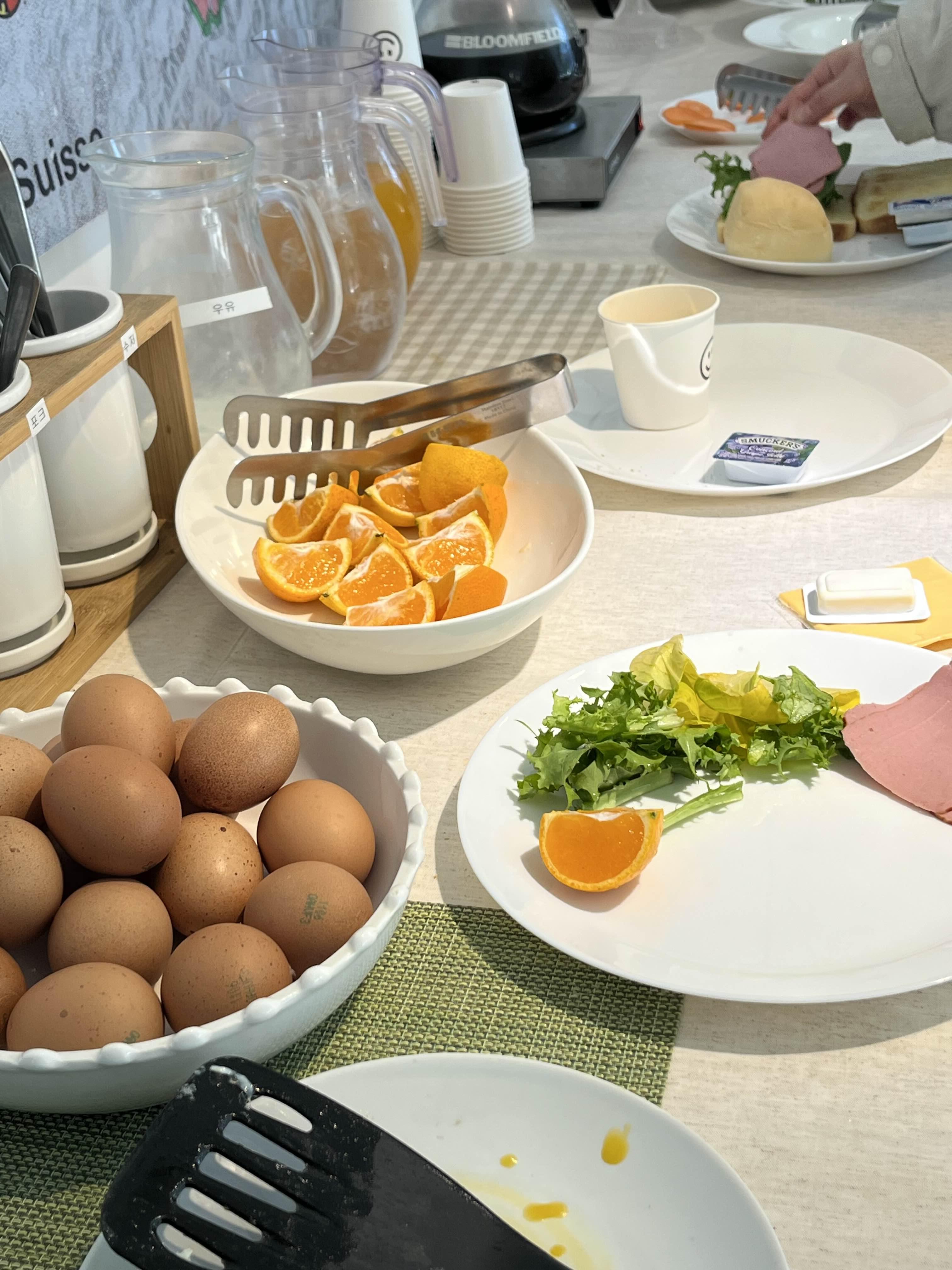 잼과 버터 까지 구비 되어있었어요.계란도 후라이로 해먹을 수 있게 준비 되어있었답니다.