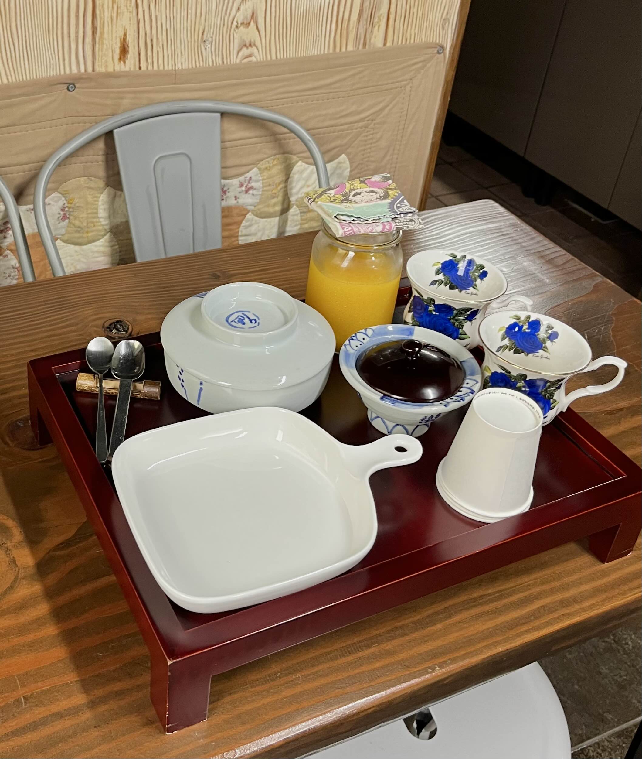 아침 시간에 사장님 께서 부엌에 방별로 식기를 챙겨둡니다.