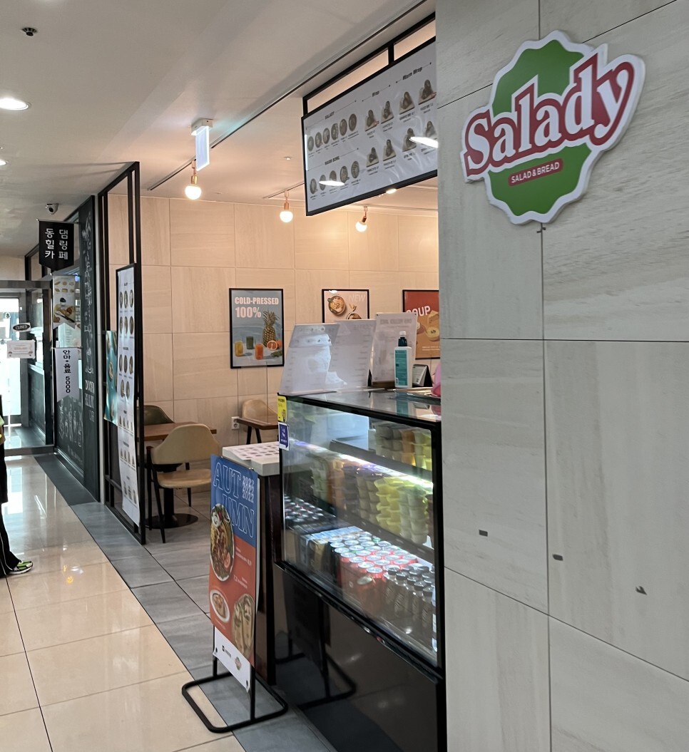 동대문 종합시장 안의 식당가는 두곳 입니다.신관 과 B동 입니다.신관 5층은 디자이너 라운지가 있는 C동 6층과 연결 되어있습니다.연결통로를 통해 한층 내려가면 바로 유리문이 보입니다.그 안으로 들어가면 푸드코트 형식의 식당가 가 나옵니다.음식 종류가 다양하며 개방형식의 식탁들이 있습니다.또한 샐러디가 입점되어 있습니다.