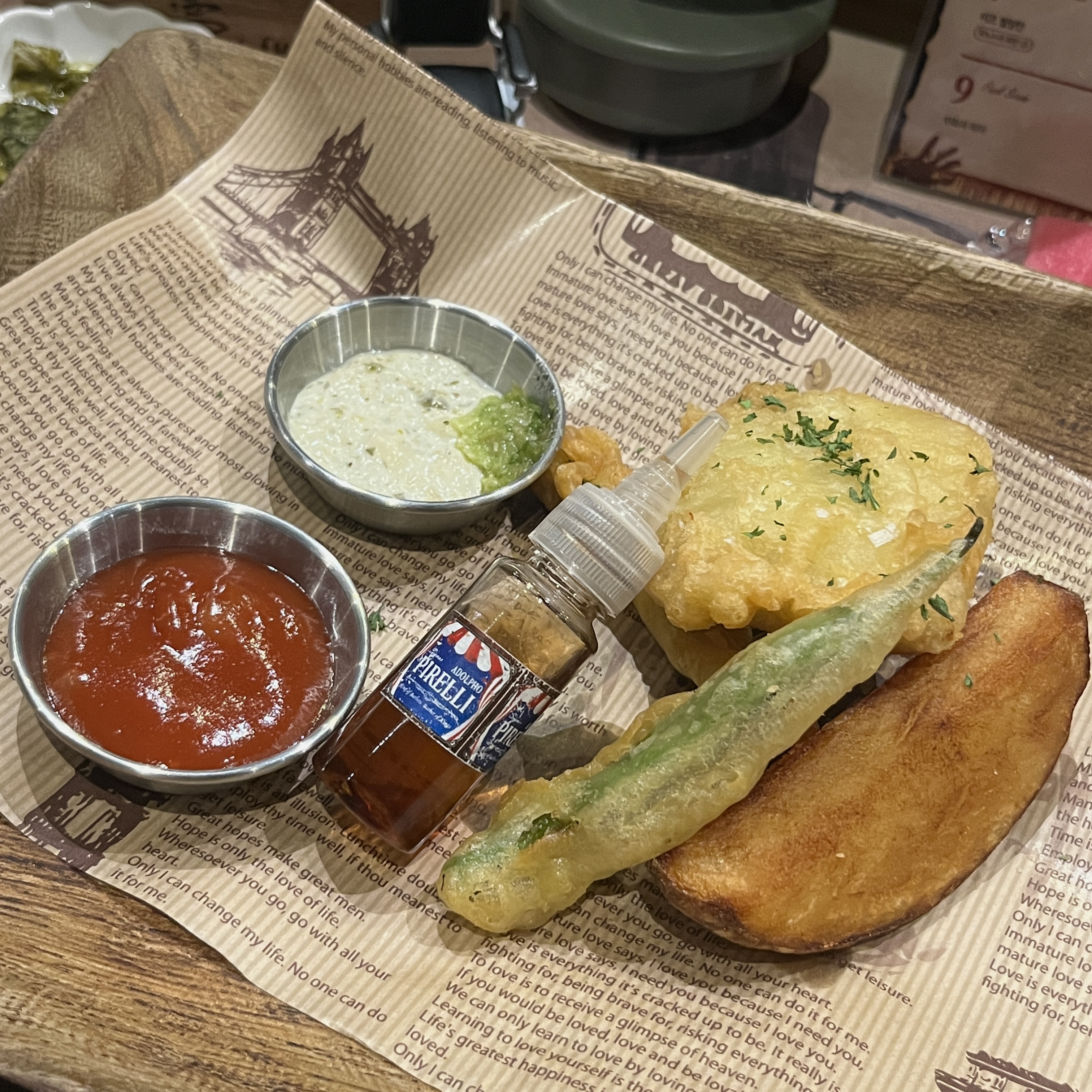 피시 앤 칩스 그리고 피렐리의 발모제를 연상 캐 해주는 식초입니다.
