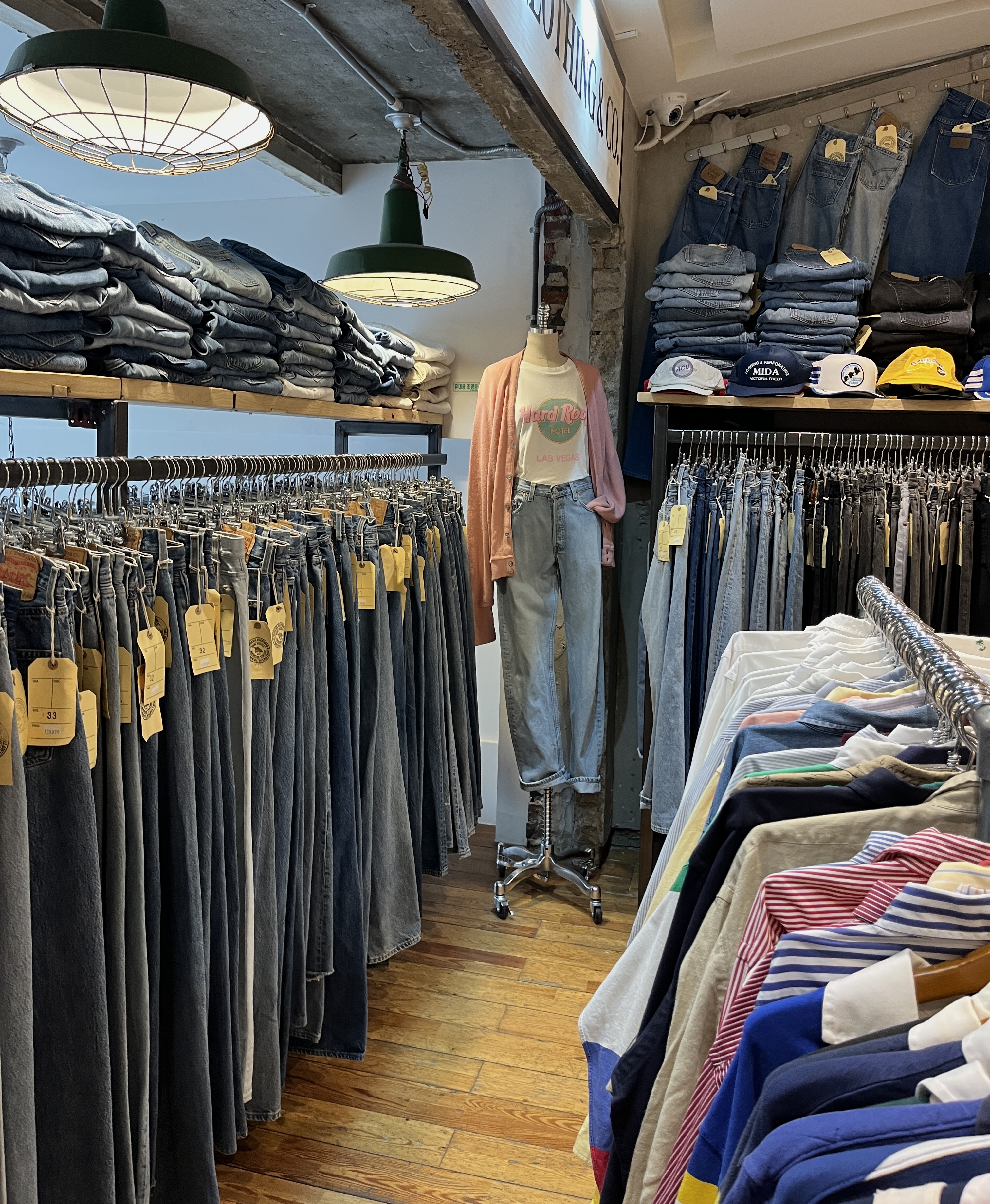 2층으로 된 큰 건물의 빈티지샵 입니다.들어서자 마자 옷들이 뺴곡히 걸려 있는걸