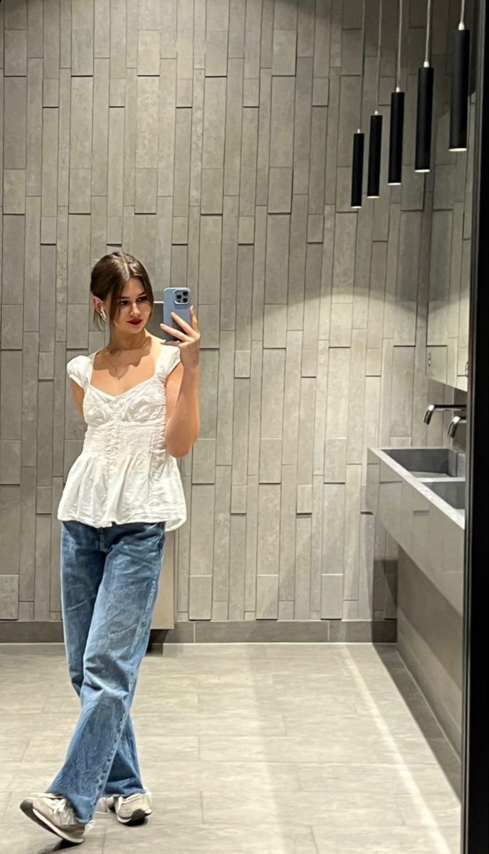 화이트 레이스 블라우스와 데님바지를 함께 매칭하는걸 추천 드려요 :-)~