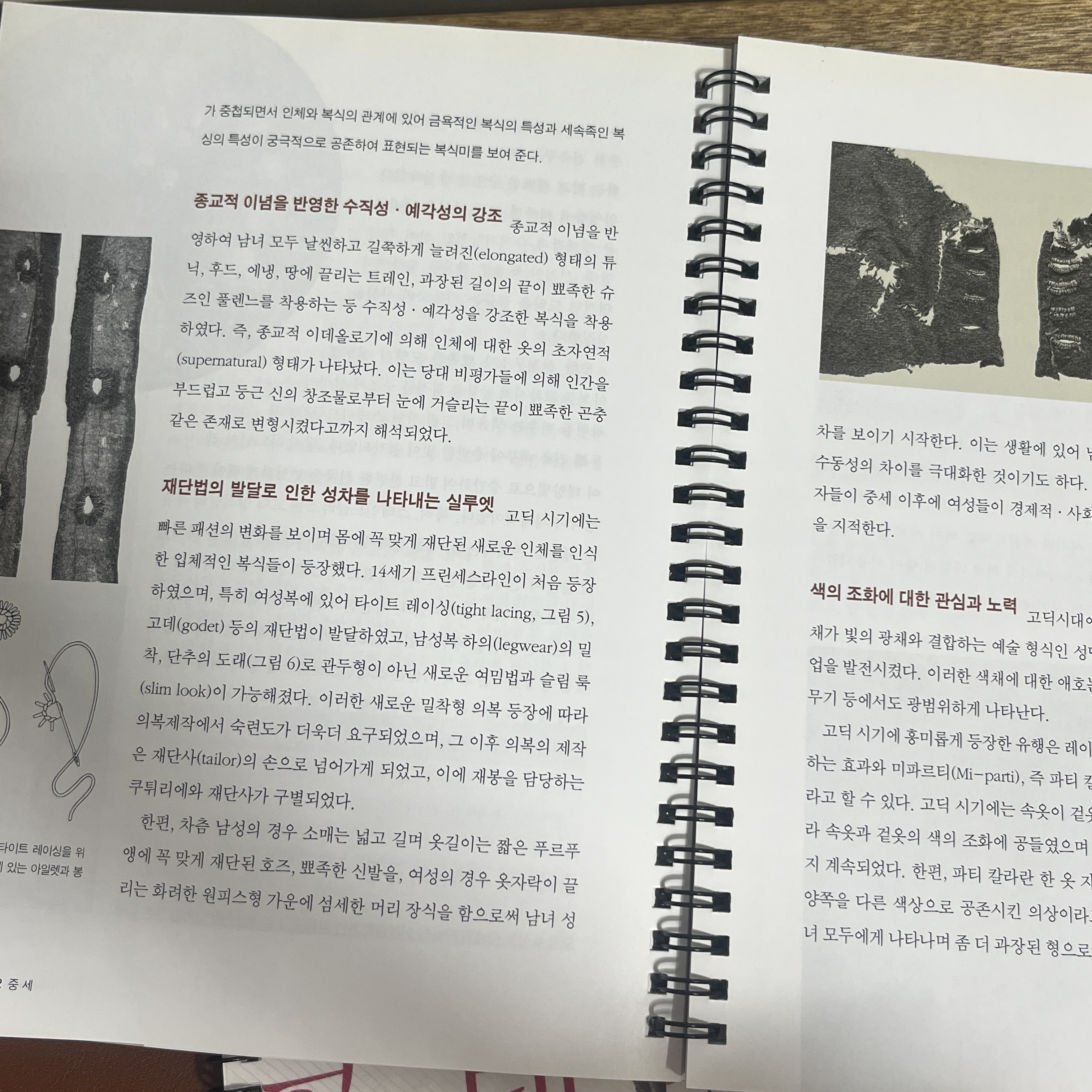 이 책을 읽으며 느낀 점은, 제가 읽었던 복식사 책들은 대부분 전공서적들로 참고 사진 보다 글들이 더 많아 읽다가 이해되지 않는 부분들은 직접 구글링을 해야 하는 번거로움이 있습니다. 유럽 복식 문화와 역사 1권과 2권은 일러스트가 메인인 책이다 보니 글을 읽고 이해가 되지 않더라도 그림으로 이해할 수 있기에 서양 복식사를 독학하기 전에 먼저 선행 학습식으로 읽었다면 좋았겠다는 생각이 들었습니다.