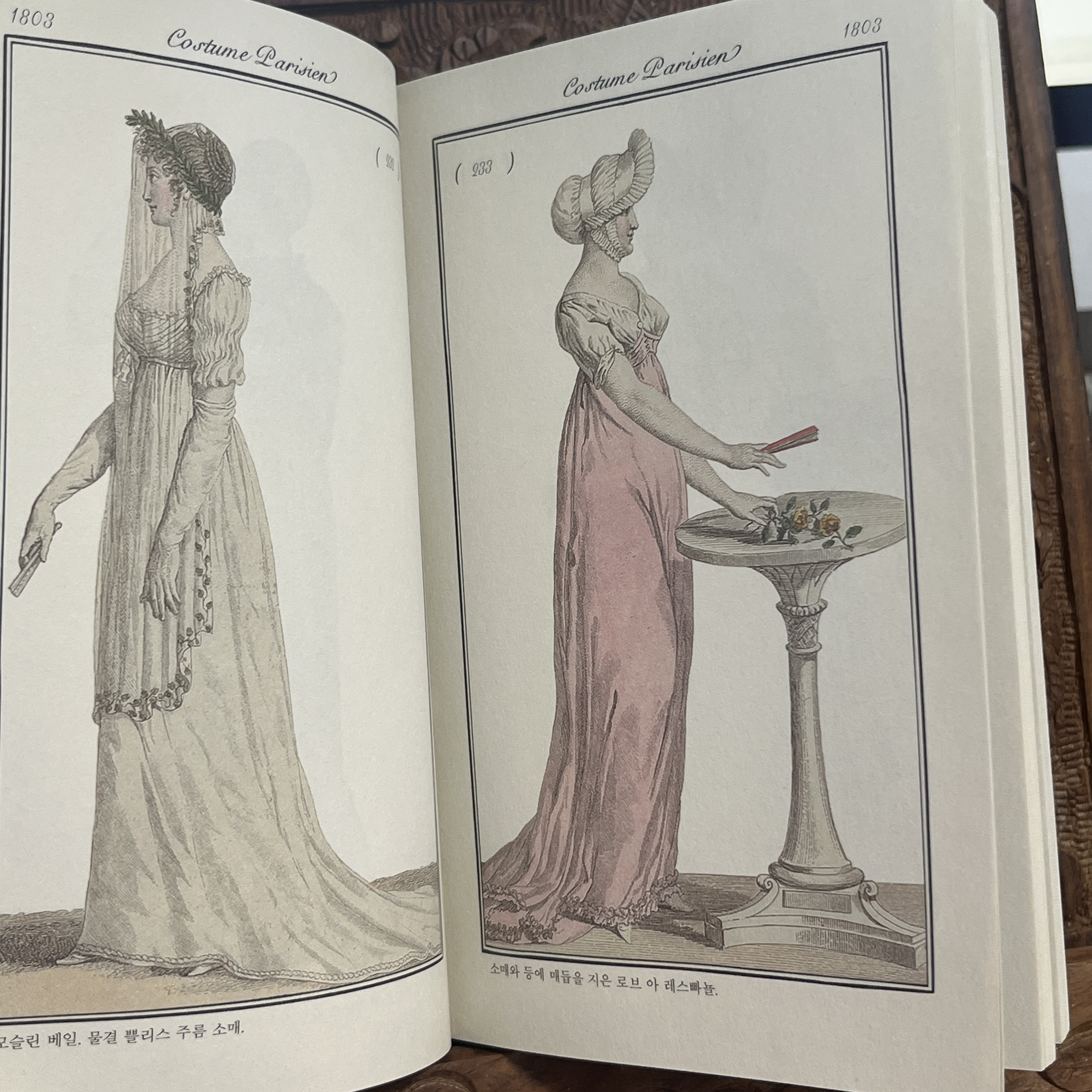 텀블벅에서 펀딩으로 구매했던 비공식 출판공방의 '라 로브 스띨 앙삐르:엠파이어 실루엣 1800-1820'입니다. 엠파이어 실루엣은 리젠시 스타일 로도도 불리웁니다.나폴레옹이 황제로 있던 시기의 유행했던 스타일로 그리스/로마 양식으로의 복귀를 추구했던 '신고전주의' 시대의 일러스트들을 묶어둔 도록입니다.