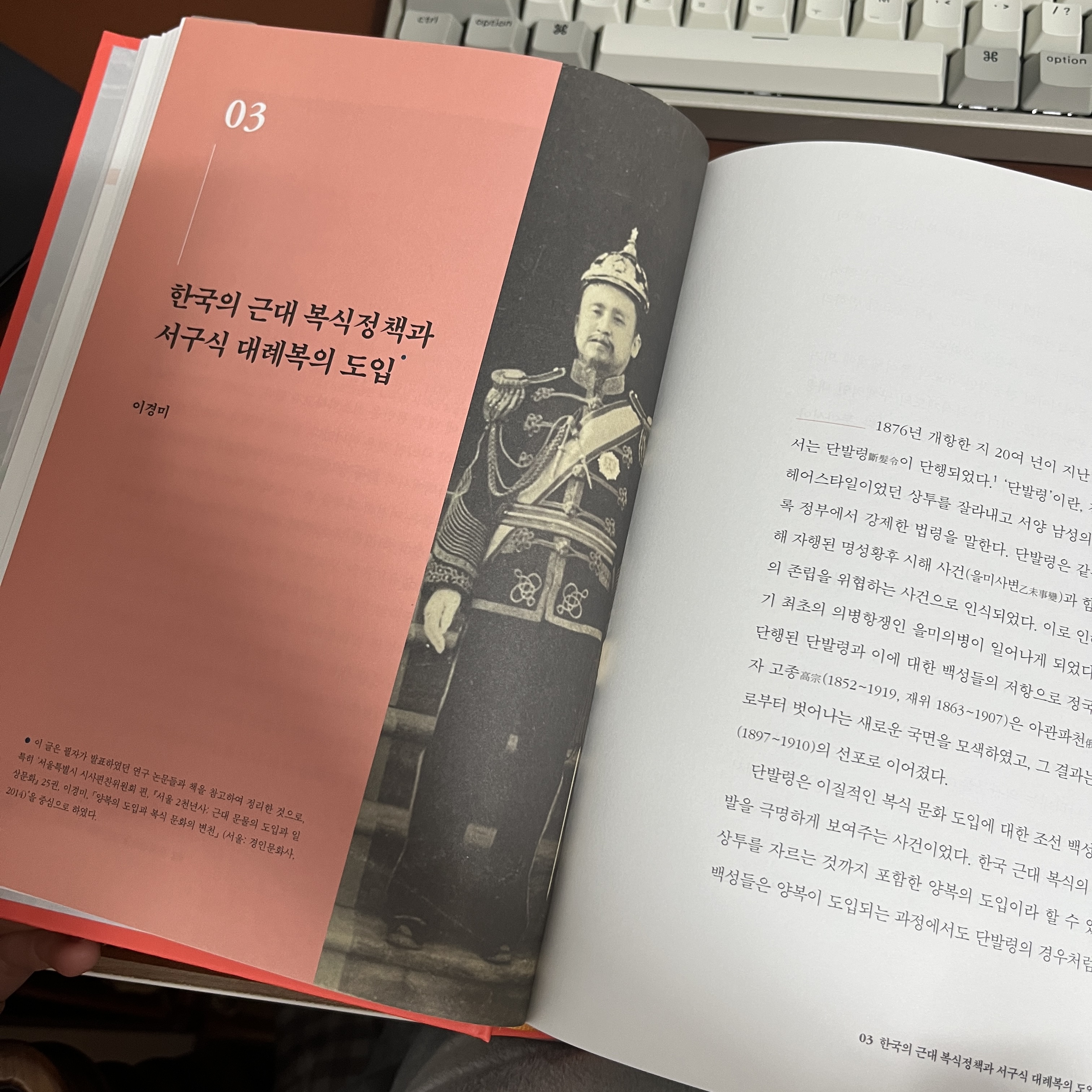 국내 에는 서양 복식에 대한 책은 여러 권 있지만 한국의 근대사 때 의복 관련 책은 (저에게는) 처음이어서 흥미를 가지고 읽기 시작했습니다. 우리나라에 관한 내용과 함께 중국 , 일본 의 복식 문화 역시 담겨 있습니다. 챕터별로 저자가 각기 다릅니다. 작가들의 국적 역시 한국 / 중국 /일본 교수님들로 마치 논문을 읽는 듯 하지만 흥미로운 책입니다. 아직 전체를 읽지는 못했지만 개항 이후부터 대한제국 시기까지인 대 한국의 '서구식 대례복'의 도입과정이 무엇인지 조금이니마 알 수 있게 되었습니다.