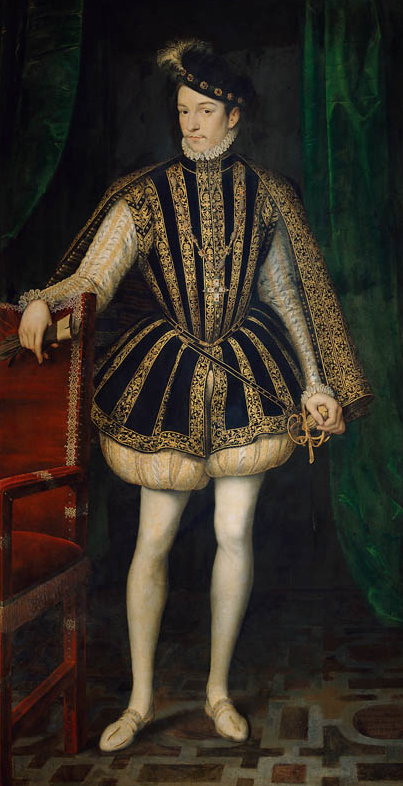 바지는 밑단으로 갈수록 슬림해집니다. 16세기 남성 귀족들은 셰익스피어와 극배우들이 입었던 하의가 보다는 무릎까지 오는 바지와 스타킹과 같은 긴 양말의 호즈를 착용했습니다. 16세기 초반에서 시간이 흐를 수록 팬치는 부피가 더 부풀어 오르며 트렁크 호즈 등 여러 형태가 등장 했습니다.남성들은 자켓 위에 가운형식의 외투를 걸치기도 했습니다.16세기 중반 이후에는 엉덩이까지 오는 케이프를 두르기도 했습니다. 소케이프는 소매가 달려있기도 했고 , 어깨 한쪽에만 걸치는 스타일도 있었습니다.