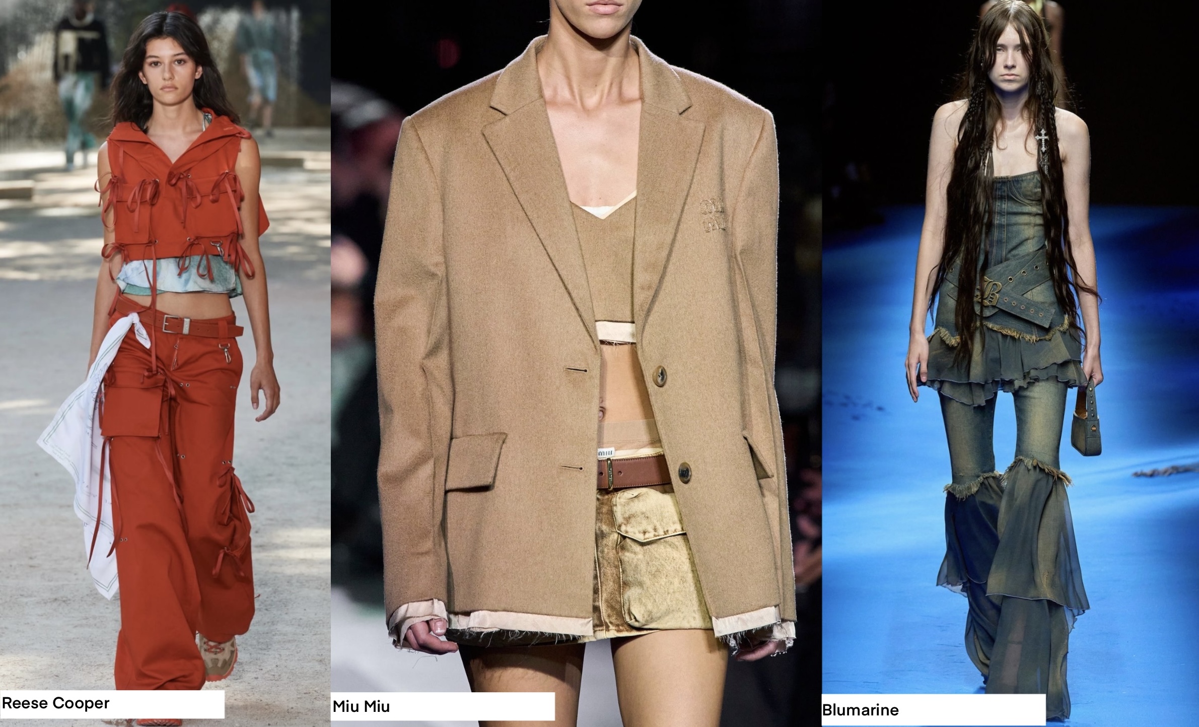90년도 후반 세기말 이였던 99년도 에서 2000년도로 넘어가는 순간 컴퓨터 연도표기 문제로 혼동이 생기는 걸 'Y2K 문제'라고 불리었습니다. 그렇게 지구 종말은 오지 않고 새로운 21세기가 시작되었으며 현재는 2000년대의 스타일을 의미합니다. 한때는 패션 암흑기로 불리었지만 작년부터 트렌드로 급부상하여 2023년도 에도 트렌드 중 하나로 자리매김 했습니다. Y2K의 스타일 중 하의를 허리가 아닌 골반쯤 에 걸쳐 입는 '로우라이즈'는 미우미우의 컬렉션을 필두로 큰 인기를 누리고 있습니다. 다양한 브랜드 컬렉션에서 볼 수 있지만 미우미우의 한 뼘짜리 미니 스커트는 대중들의 머릿속에 제대로 인식시켰습니다. 2023년 역시 로우라이즈의 인기는 이어질 예정입니다. 허리를 덮는 하이웨이스트처럼 허리가 얇고 다리가 길어 보이는 효과를 주지는 못하지만 코로나 이후 자연스러움과 보다 편안한 스타일을 추구하는 트렌드에 맞춰 로우라이즈를 한번 입으면 그 편안함에 빠져버리게 될 것입니다. 웨스트 라인이 한없이 밑으로 내려간 길이만큼 상의는 한없이 짧아진 '크롭' 기장이 트렌드로 자리매김했습니다. 올해는 크롭탑 보다 더 과감해진 '브라탑'이 트렌드로 단독으로 입기보다는 오버핏의 재킷 혹은 슈트 재킷과 매칭하여 과감하지만 미니멀한 스타일로 연출할 수 있습니다.