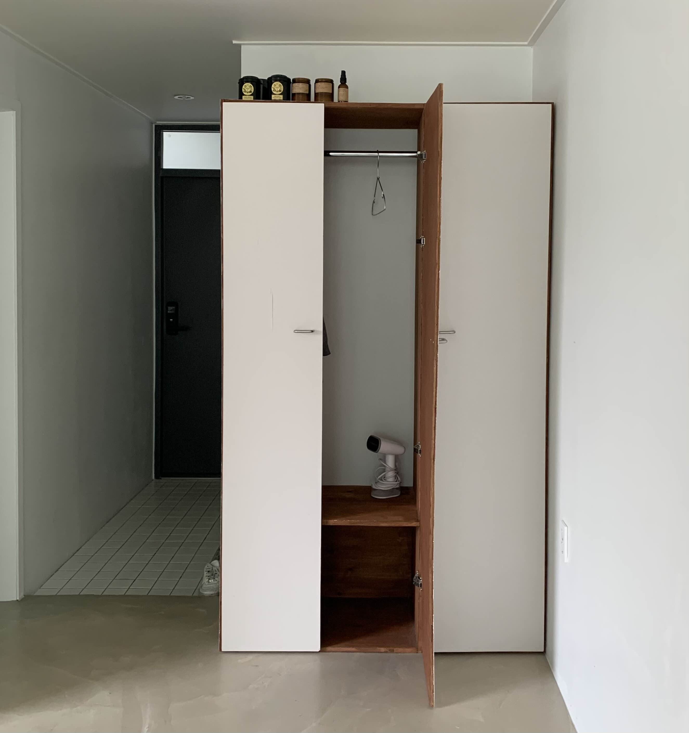 옷장 안에는 스팀 다리미도 있습니다.보통 옷을 다려서 입는 편이라