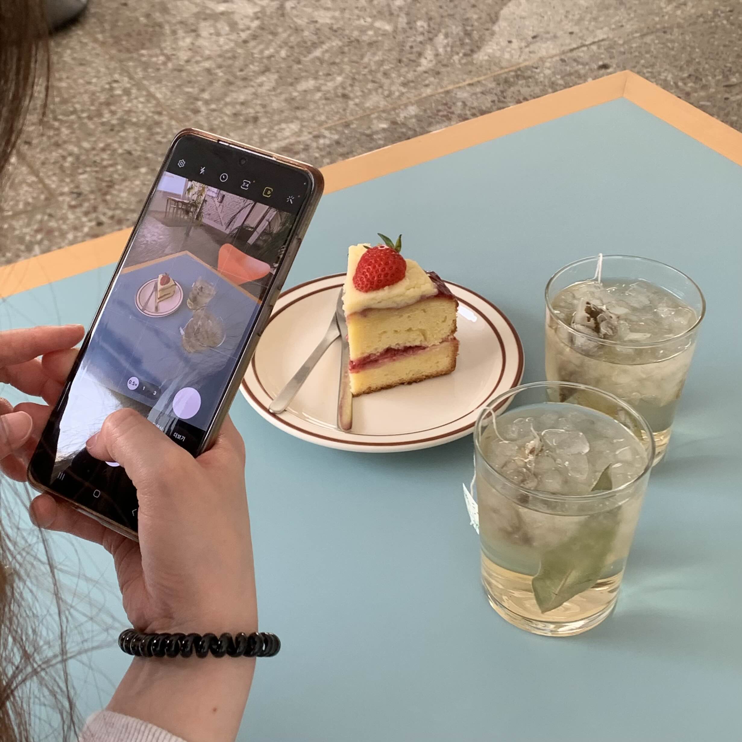 테이블 색감이 푸른계열 이라 그런지 빅토리아 케이크와 함께하니 더 먹음직스러워 보였습니다!!!